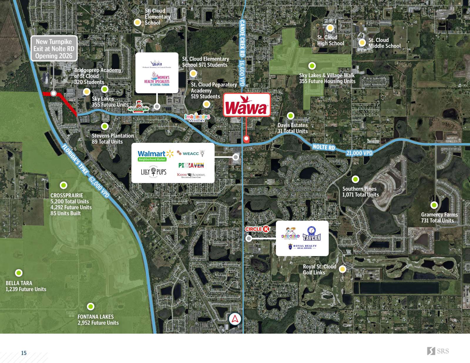 The lease is guaranteed by Wawa Inc., an investment grade (Fitch: BBB), nationally recognized, and an established convenience store and gas brand with over 1,100+ locations Brand new 20-year ground lease with 6 (5-year) options to extend, demonstrating their long-term commitment to the site The ground lease features 7% rental increases every 5 years starting in lease year 11 and at the beginning of each option period Wawa was ranked No. 22 in Forbes 2024 Ranking of Americas largest private companies 2025 construction with high quality materials and distinct design elements Located at the signalized, hard corner intersection of Canoe Creek Rd and Nolte Rd Part of a larger retail development that features Wawa (Lot 1), McDonalds (Lot 2), Sud Stop Car Wash (Lot 3), Chipotle (Lot 4), Dutch Bros (Lot 5), Heartland Dental (Lot 5), a multi-tenant strip (Lot 5), and future retail on Lot 7 The adjacent Walmart Neighborhood Market ranks in the 81st percentile (122 out of 672) of all nationwide locations via Placer.ai The new FL Tpke connection onto Nolte Road will provide consistent traffic to the site Adjacent to Stevens Crossing, a new development with Walmart Neighborhood Market, Heartland Dental, Kiddie Academy, a 7-tenant strip, and more Wawa merchandise sales per store averaged $7.1M for the year ended 2024 versus an industry average of $2.7M for 2023 (Source: NACS) Gasoline sales totaled 3.1 billion gallons for the year 2024, an average of 69,042 gallons sold a week per store, over two times the industry average of 32,726 per store per week in 2023 (Source: NACS)